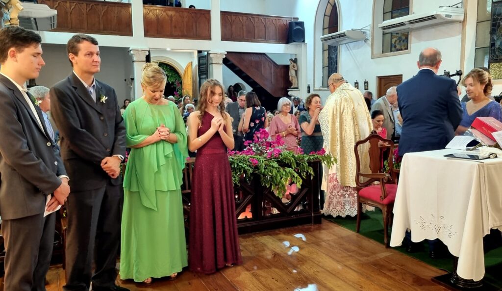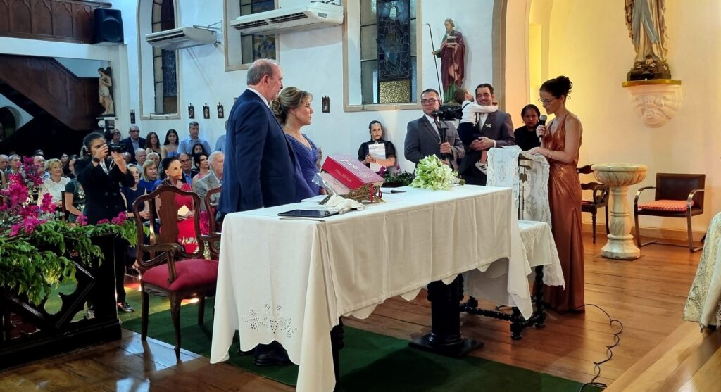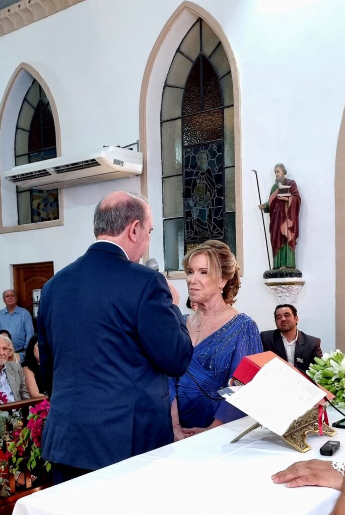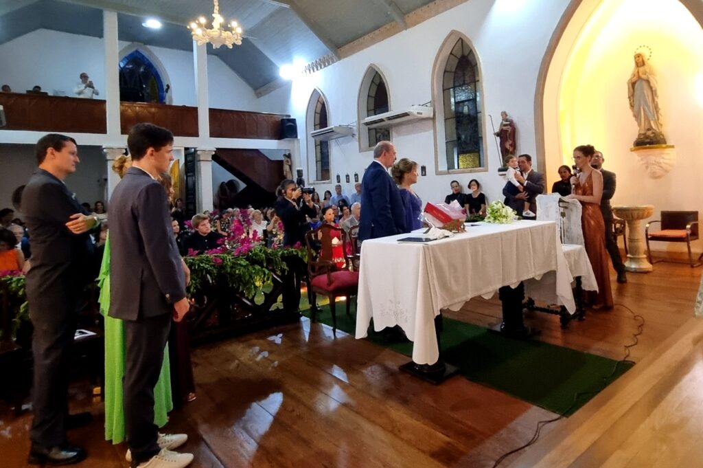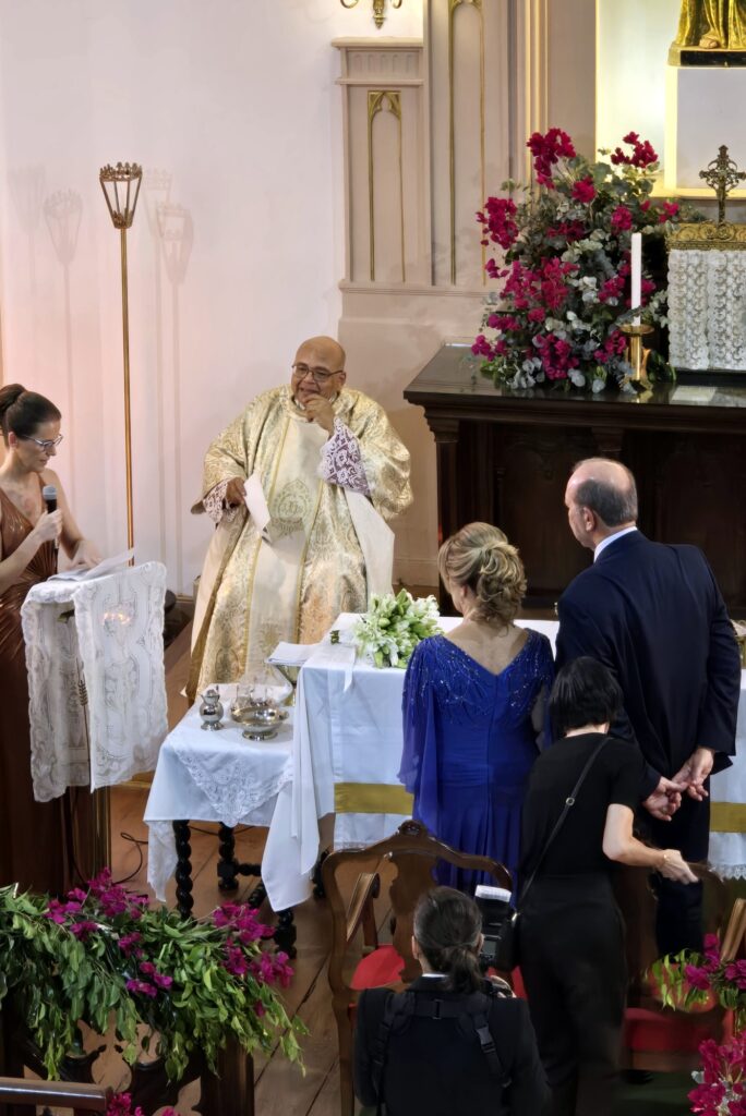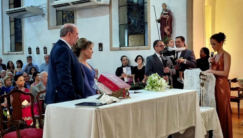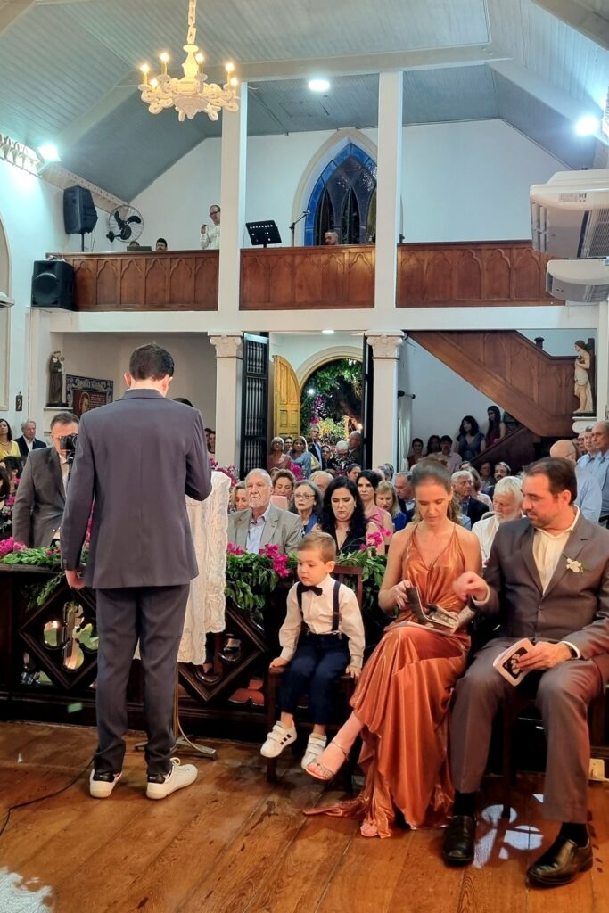 Adoramos a lembrança, as fotos estão maravilhosas, nos deliciamos com todos os detalhes. Desde a decoração da igreja , ainda vazia, até a celebração onde a música de vcs brilhou e a família participou intensamente ! Obrigado por tudo! Recebam nosso abraço carinhoso!